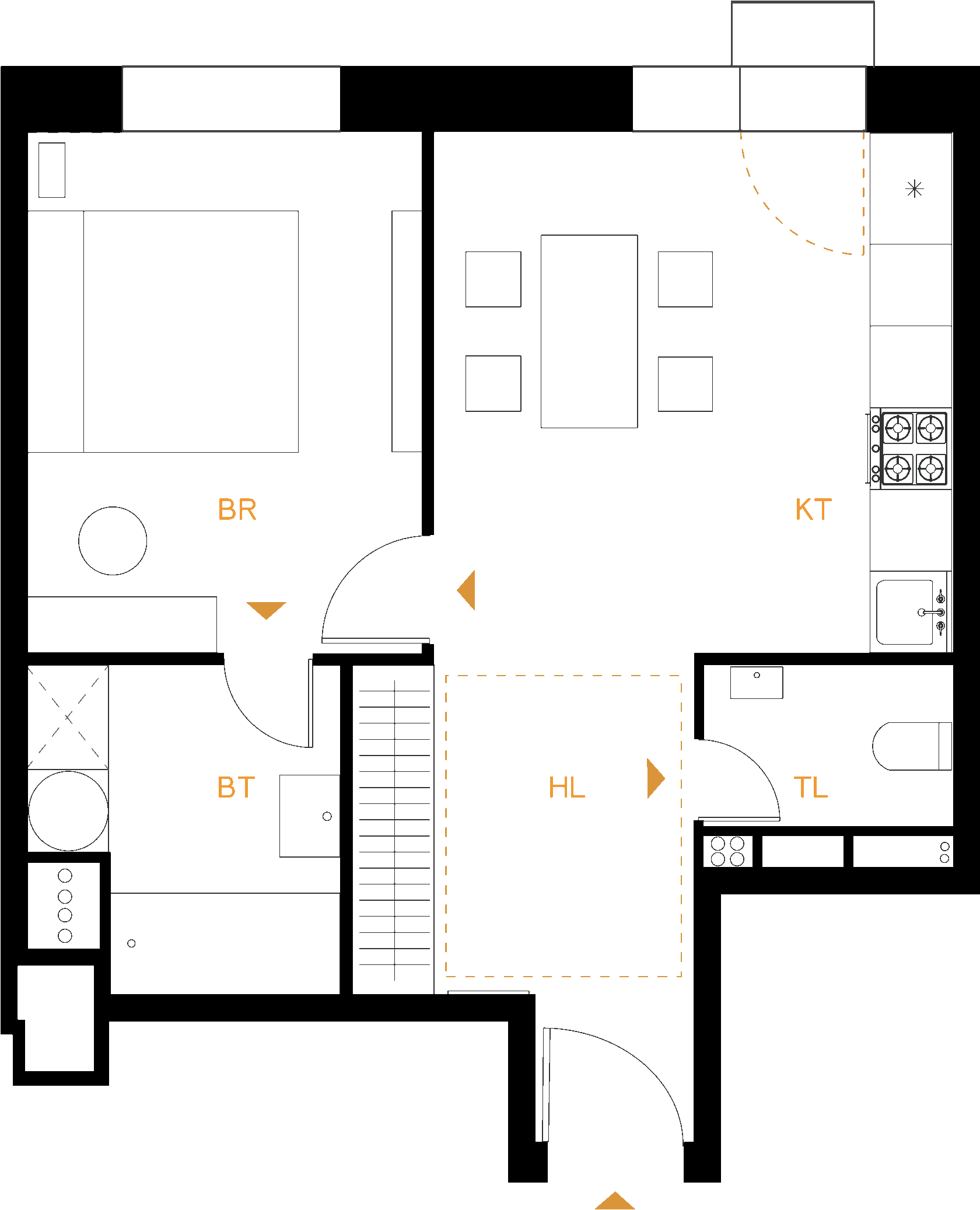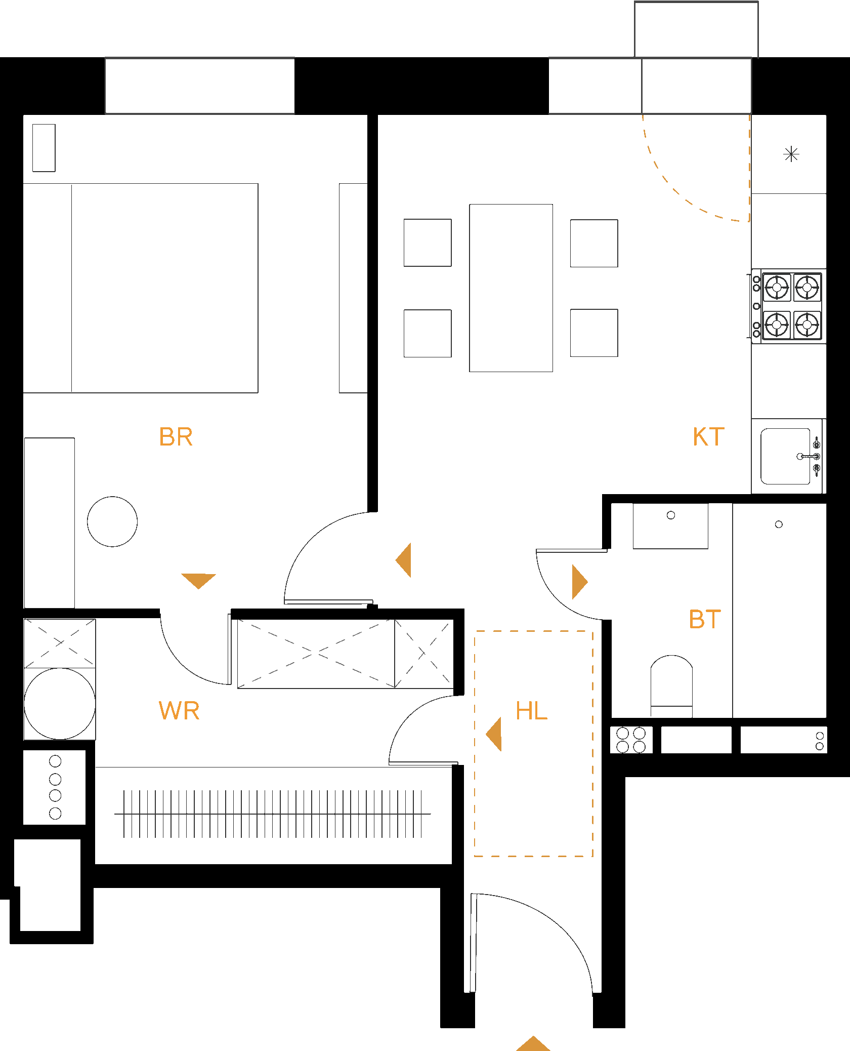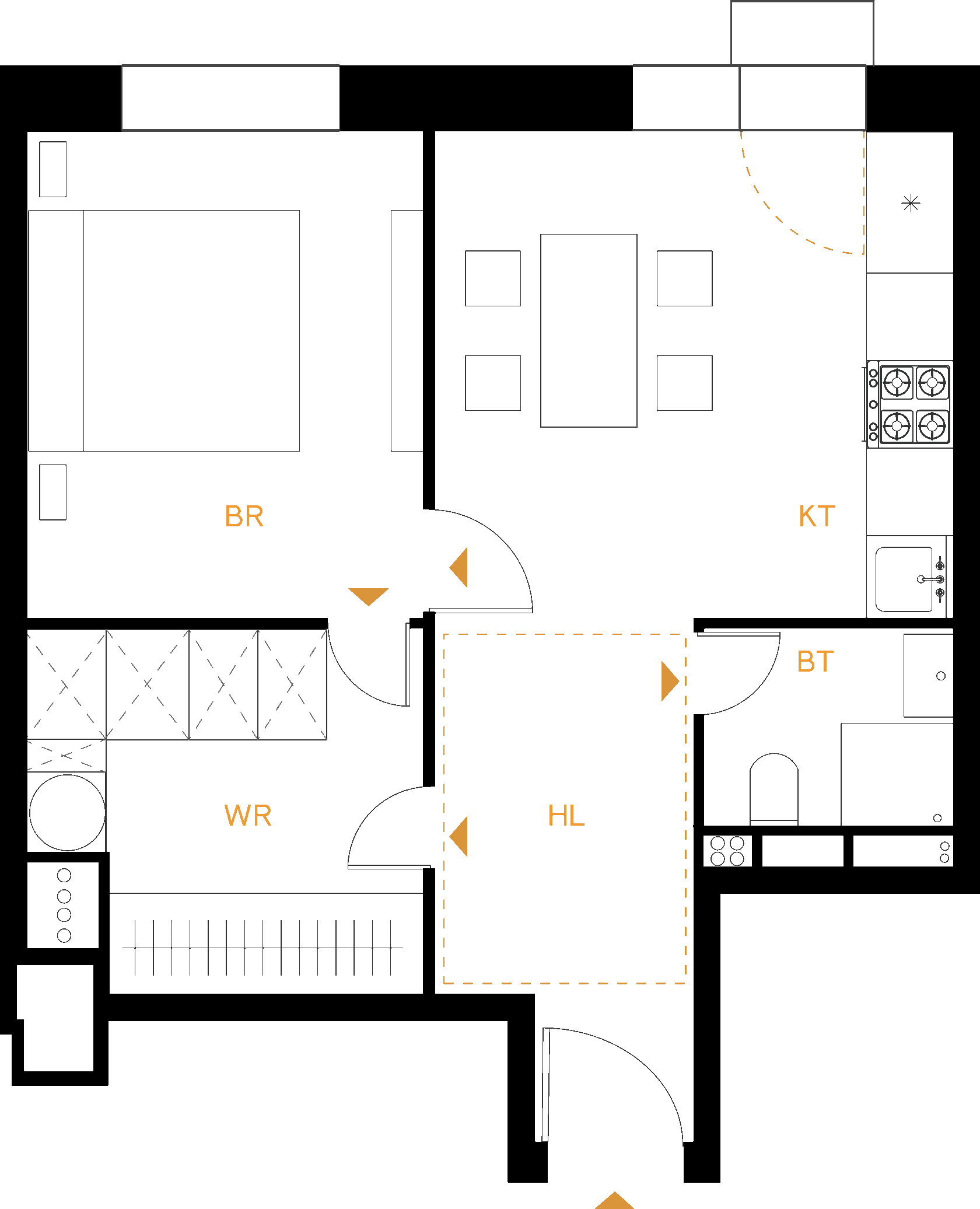 The third layout option also accommodates to place a walk-in closet with a laundry area. This configuration provides a space for a workplace in the private area and allows for a bathtub in the bathroom.