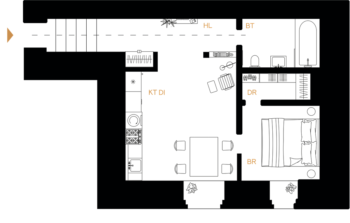 Благодаря переменной этажности в прихожей зоне квартиры располагается лестница, а высота потолков достигает более четырех метров.